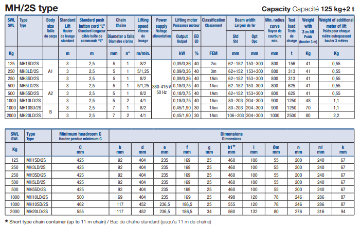 - כושר הרמה (SWL): מ־125 ק״ג ועד 2 טון בהתאם לדגם בסדרת MH