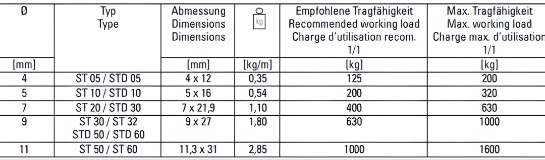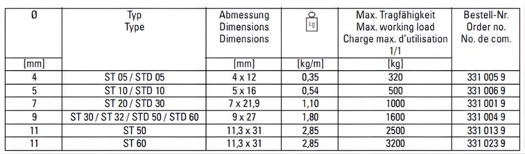 מצורפת דוגמה של טבלת שרשרות מגולוונות מהיצרן STAHL גרמניה: